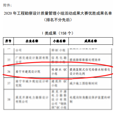 近日,中國勘察設計協(xié)會公布了2020年工程勘察設計質量管理小組活動成果大賽結果,我院給排水QC小組申報的《提高裝配式住宅給排水標準化設計的比例》課題榮獲2020年全國工程勘察設計質量管理小組活動成果大賽I類成果獎。